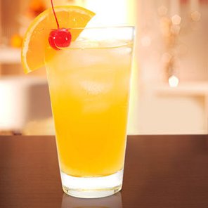 2 bis 3 Eiswürfel hinzufügen und mit Orangensaft auffüllen.